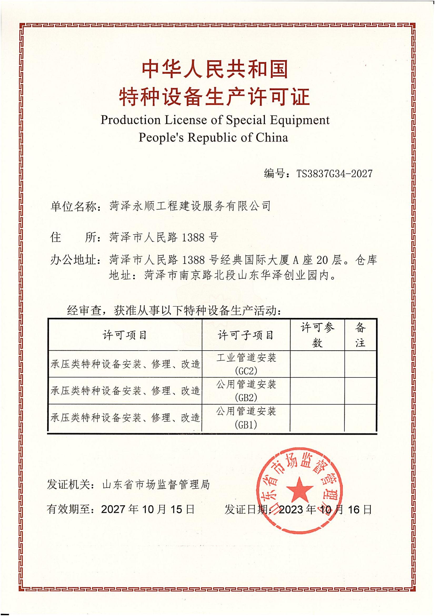 永順工程公司喜獲GB1、GB2、GC2特種設(shè)備生產(chǎn)許可證