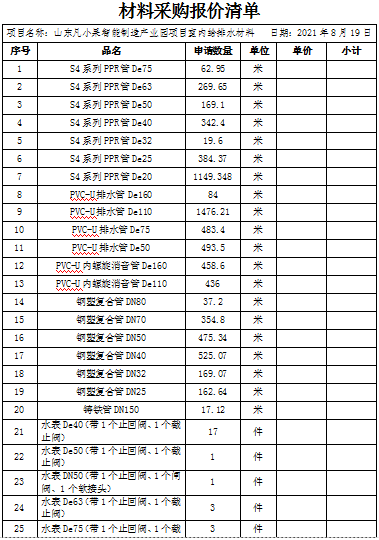 1.材料采購內(nèi)容:山東凡小果智能制造產(chǎn)業(yè)園項目室內(nèi)給排水材料,具體規(guī)格要求、數(shù)量詳見材料報價清單。