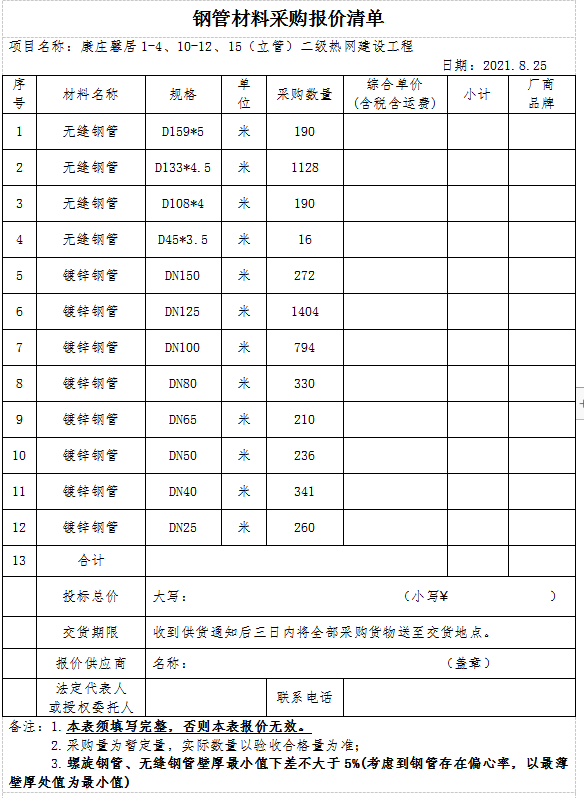 1.材料采購內(nèi)容:康莊馨居1-4、10-12、15(立管)二級熱網(wǎng)建設(shè)工程用鋼管,具體規(guī)格要求、數(shù)量詳見材料報(bào)價(jià)清單。