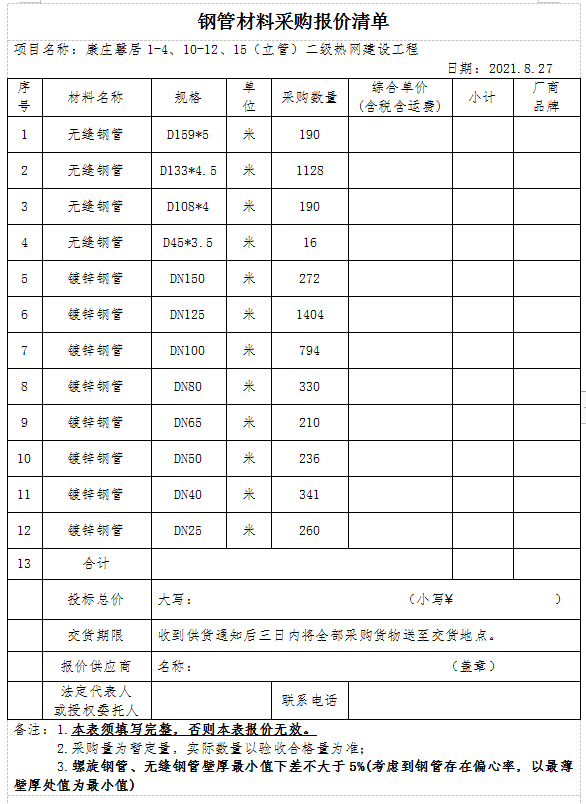 1.材料采購內容:康莊馨居1-4、10-12、15(立管)二級熱網建設工程用鋼管,具體規(guī)格要求、數量詳見材料報價清單。
